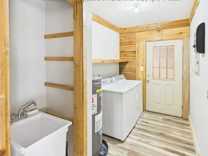 The kitchen is spacious and functional, equipped with natural wood cabinetry and generous counter space for cooking and entertaining. Every detail reflects the craftsmanship and character of a true log cabin, while modern touches ensure comfort and convenience. The home also includes a 2-car attached garage, providing ample storage and protection for vehicles or outdoor equipment.