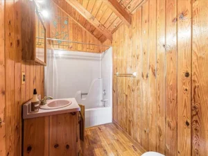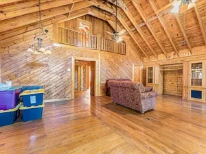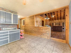 The home itself offers approximately 2,403 square feet of inviting living space, featuring 4 bedrooms and 3 bathrooms. Designed in charming log-style architecture, the home reflects warmth and country appeal from the moment you step inside. The spacious open floor plan is enhanced by cathedral ceilings, allowing natural light to pour into the main living areas. A wood-burning fireplace anchors the living room, creating a cozy focal point that perfectly complements the mountain setting.