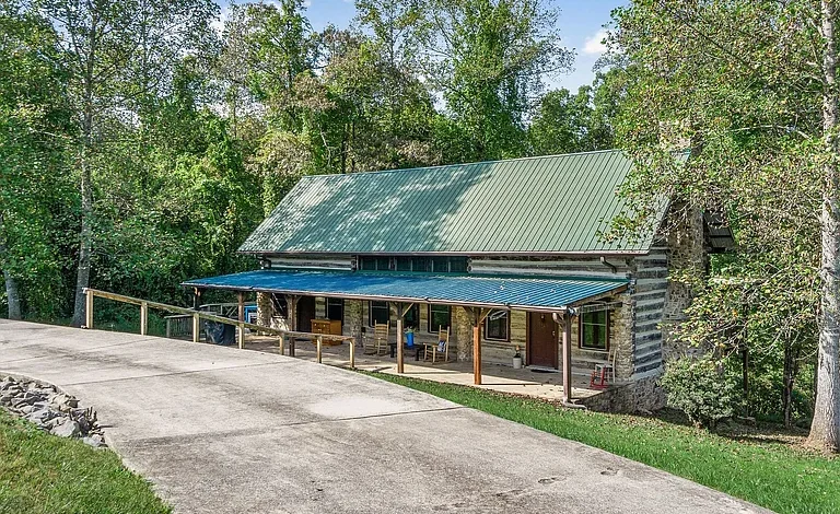 The exterior of this 13.98-acre Baxter, Tennessee property showcases upgraded Poly-Crete chinking with natural quartz aggregate. This self-leveling finish enhances durability, resists cracking, and provides additional insulation — an important feature for maintaining comfort across all seasons. A stunning sandstone rocking chair front porch welcomes you home and sets the tone for relaxed country living on nearly 14 private acres.