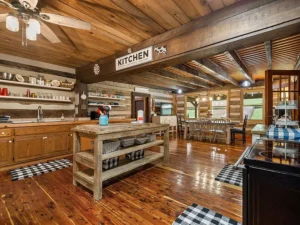 The exterior of this 13.98-acre Baxter, Tennessee property showcases upgraded Poly-Crete chinking with natural quartz aggregate. This self-leveling finish enhances durability, resists cracking, and provides additional insulation — an important feature for maintaining comfort across all seasons. A stunning sandstone rocking chair front porch welcomes you home and sets the tone for relaxed country living on nearly 14 private acres.