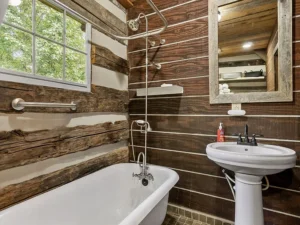 Inside the 2,444-square-foot home, rustic finishes and a romantic fireplace add warmth and authenticity. Modern plumbing, updated electrical systems, and central heating and air conditioning ensure that this historic-inspired residence delivers everyday comfort. The main-floor bathroom features elegant stone tile floors and a beautiful antique clawfoot tub, preserving the home’s timeless charm while enhancing functionality.