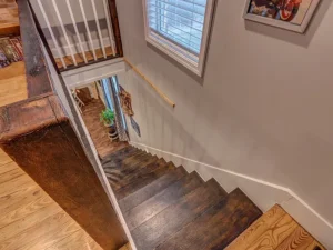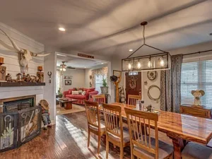 The main floor layout offers both convenience and comfort. You’ll find a spacious mudroom — perfect for country living on 15 acres — along with a pantry and full bathroom. The kitchen flows seamlessly into a generous dining area with a cozy fireplace, creating a warm gathering space. The living room provides additional room for relaxation, while the primary suite is conveniently located on the main level. The primary bedroom features a large ensuite bathroom with a double sink vanity, offering both privacy and practicality.