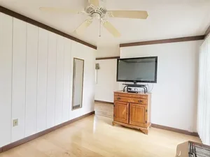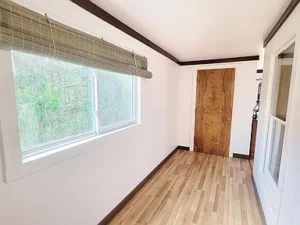 At the center of this 21.3-acre property in Englewood, TN, the main living area connects seamlessly to the rest of the home. This bright and spacious living room provides access to a screened rear patio, perfect for enjoying the outdoors in comfort. Also located in this central area is a practical office space and a full bathroom with a walk-in shower.