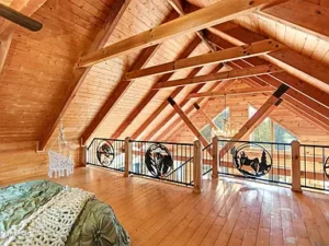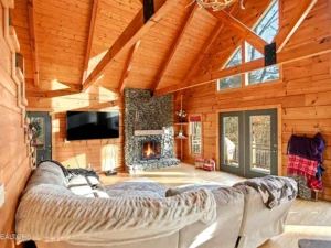 Inside, this 3-bedroom, 4-bath home showcases rustic elegance with vaulted ceilings, expansive windows, and a stunning wood-burning stone fireplace that anchors the main living space. Natural light pours in, highlighting the warm wood interior and creating an inviting atmosphere across all 2,035 square feet. The thoughtful layout includes two spacious suites—one on the main level featuring a striking stone and rock walk-in shower, and another in the basement with a tile walk-in shower, soaking tub, and double vanities. Upstairs, a loft bedroom with a full bath provides additional flexibility for guests or a private retreat.