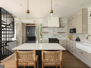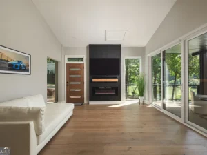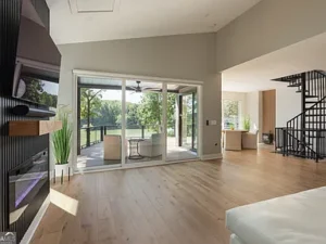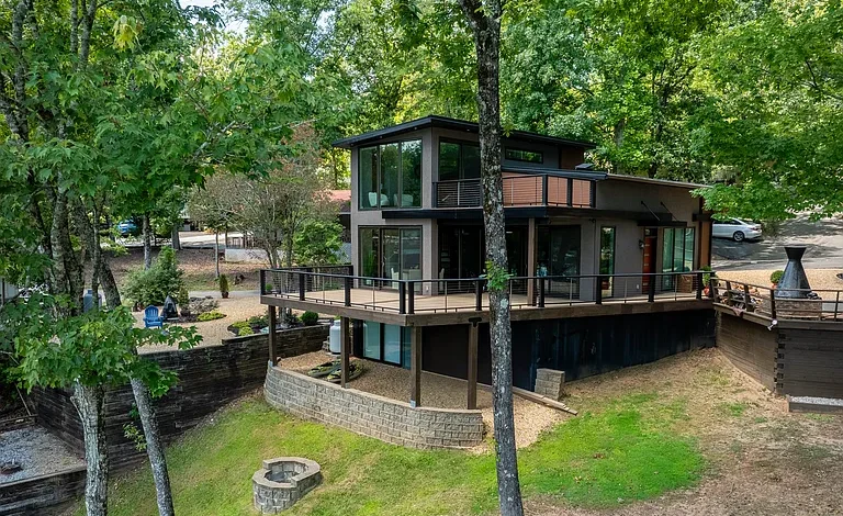 The cabin itself is a striking modern contemporary design with two bedrooms and two bathrooms across 1,396 square feet of thoughtfully planned living space. Floor-to-ceiling windows capture panoramic lake views and fill the home with natural light, while full-home motorized blinds allow effortless control at the touch of a button. This is a fully integrated smart home, offering remote access to HVAC, lighting, security, and other systems directly from your phone. The open-concept interior showcases sleek finishes, modern lighting, and a stylish kitchen with a large island, soft-close cabinetry, hard-surface countertops, and upgraded appliances. A whole-house water filtration system provides clean, fresh water throughout, and a stackable washer and dryer are neatly concealed within custom cabinetry.