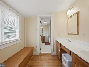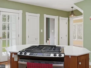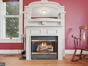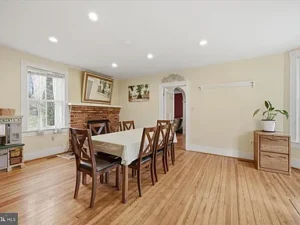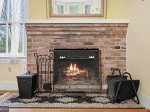 Inside the home, you’ll find timeless features blended seamlessly with modern comfort. Hardwood floors run throughout, adding warmth and authenticity to the living spaces. The farmhouse kitchen connects directly to a wrap-around covered porch, creating a natural flow between indoor and outdoor living on these 5 acres. The dining room and living room each feature their own fireplace, enhancing the historic ambiance of this Winchester, VA home, while a cozy den or office with built-in bookcases provides a perfect workspace or reading area.