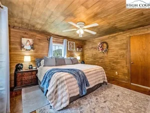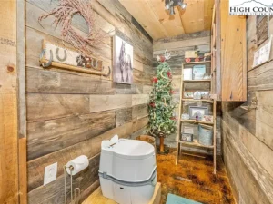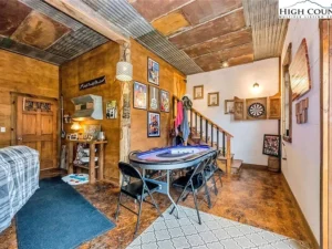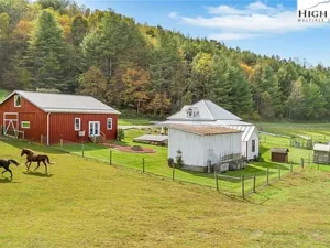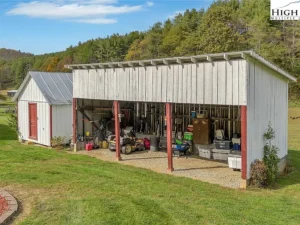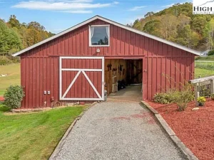 Supporting the land are multiple outbuildings, including four older barns suitable for hay or equipment storage, a chicken coop, and a newer 4-stall horse barn that serves as a centerpiece of the property. This barn on the 50.01-acre Piney Creek, NC property features four spacious stalls and a dedicated tack room. Additionally, it includes 716 square feet of finished rustic-style space complete with a bar area—perfect for entertaining guests or creating a relaxing retreat. Above, another 612 square feet provides flexible space for a bunk room, office, or studio.