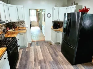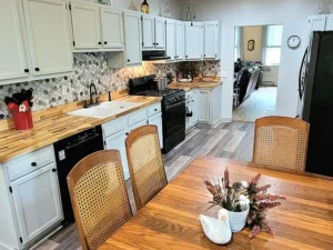 The first floor showcases a newly designed custom kitchen that serves as the heart of the home. Bathed in natural light, the kitchen includes an inviting eat-in area perfect for gathering. Butcher block countertops pair beautifully with a coordinating tile backsplash and a farmhouse sink, creating both warmth and functionality. New flooring enhances the space, while high-end appliances elevate everyday living. The kitchen features a Samsung gas range, a Frigidaire side-by-side refrigerator, and a Bosch dishwasher, all thoughtfully selected to complement the home’s updated yet timeless aesthetic. Recessed lighting and ceiling fans add comfort and style, completing this impressive culinary space within the 2,620-square-foot home.