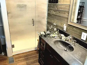 The bathrooms reflect equally careful attention to detail. The stunning modern farmhouse-style bathroom includes a charming barn door entryway, shiplap wall covering, granite countertops, ceramic tile, and a classic vanity paired with stylish lighting. This blend of rustic character and contemporary finishes aligns perfectly with the historic charm found throughout the rest of the home. With three bedrooms and two baths, the layout offers flexibility for family living, guests, or even a dedicated office or creative space.