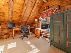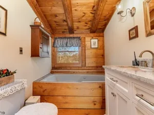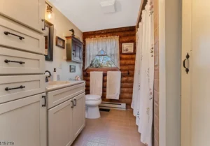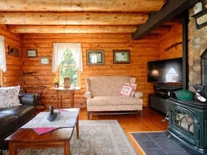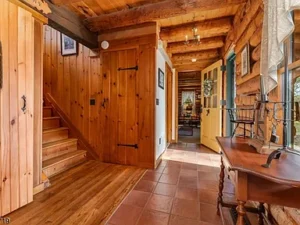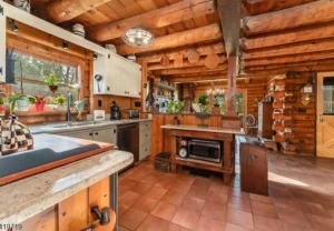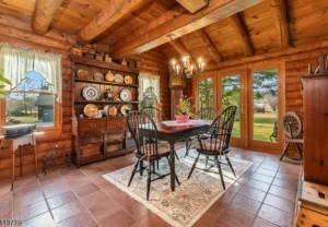 The custom log home showcases thoughtful design and superior craftsmanship throughout. Inside, you’ll find a beautifully renovated kitchen that seamlessly blends style and functionality, opening into warm and inviting living spaces. Rich hardwood flooring runs throughout the home, enhancing its timeless appeal. The living room serves as a central gathering space, anchored by a charming wood-burning stove that creates a cozy and welcoming atmosphere—perfect for relaxing evenings or entertaining guests within this elegant 7.51-acre property in Holland Township, NJ.