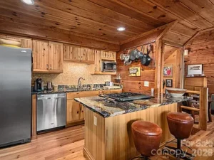 The home itself features 2 bedrooms, 2 bathrooms, and approximately 1,484 square feet of thoughtfully designed living space. Inside, you’ll find a perfect blend of rustic charm and modern sophistication. The chef’s kitchen is a standout feature, complete with high-end finishes, stainless steel appliances, and an oversized gas range—ideal for cooking and entertaining. Every detail of the home has been carefully curated, making it feel both inviting and refined.