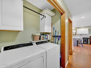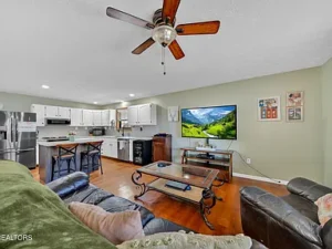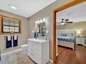 The stunning kitchen in this $450,000 property in La Follette, TN has been recently remodeled with bright white cabinets, recessed lighting, custom marble countertops, and stainless steel appliances that are only a few years old. The home also features luxury vinyl plank flooring throughout, meaning no carpet anywhere in the house, which is both stylish and practical for rural living.