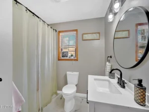 Beyond the barns and pastures, the property also features an adorable hemlock wood-sided cabin that has been completely renovated by the current owner. The 2-bedroom, 2-bathroom home offers approximately 1,040 square feet of living space, blending rustic charm with modern upgrades. Inside the home, you’ll find beautiful real wood trim and doors that preserve the cabin’s character while the updates provide comfort and style.