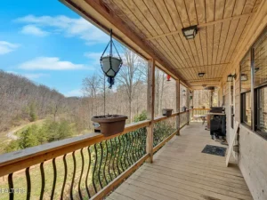 One of the most enjoyable features of the 12.1-acre property in La Follette, TN priced at $450,000 is the covered front porch, where you can relax with your morning coffee while watching your animals graze across the peaceful countryside.