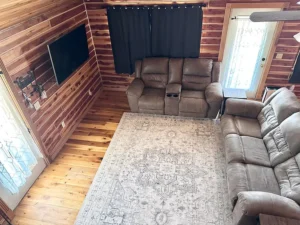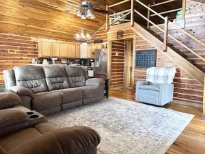 At the heart of the 47 acres sits a beautifully crafted 3-bedroom, 2-bathroom red cedar log home with approximately 1,722 square feet of living space. Designed with both comfort and character in mind, the home features an inviting open-concept layout that seamlessly connects the kitchen and family room, creating a warm and welcoming environment for gatherings and everyday living.