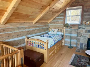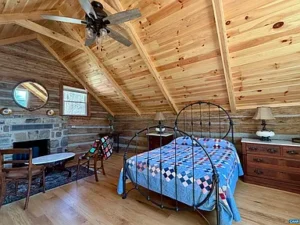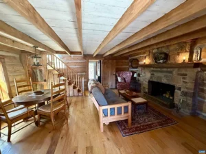 The cabin showcases remarkable historical details, including hand-hewn V-notch logs, stunning American chestnut wood accents, and yellow pine tongue-and-groove ceilings that highlight the authentic craftsmanship of the 19th century. Solid oak floors run throughout the cabin, adding warmth and durability to the interior. Two impressive wood-burning stone fireplaces serve as both functional heating sources and beautiful focal points within the home, enhancing the rustic charm of this historic property.