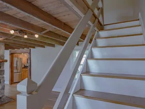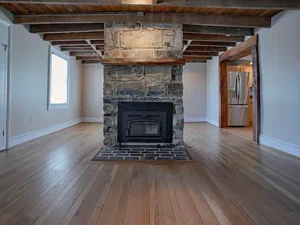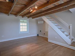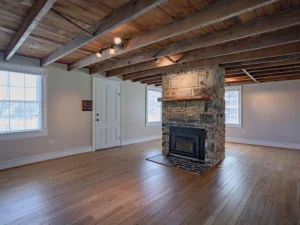 Inside, the home showcases stunning character details that make it truly special. Original oak and pine floors run throughout, complemented by walnut inlay surrounding a native stone fireplace with a wood stove insert. Exposed ceiling joists reveal the original floorboards and sawn lumber, adding a rustic authenticity that perfectly matches the 5.35-acre setting in VA.