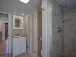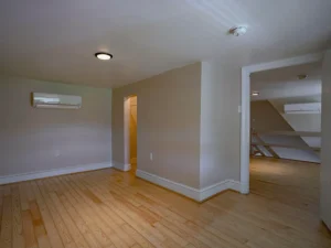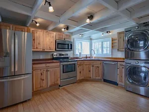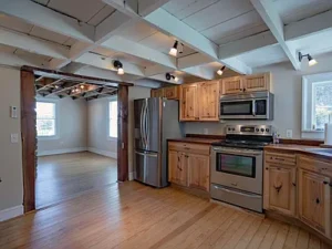 The updated kitchen brings modern convenience into this historic home, featuring hickory cabinetry, wood countertops, and stainless steel appliances. It’s a warm and inviting space that blends seamlessly with the home’s original style. The main-level bathroom is equally impressive, offering tile finishes along with radiant floor heating and hydronic baseboard heat for added comfort.