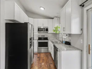 The kitchen in this 3-bedroom, 2-bath home on 0.33 acres is both stylish and functional, featuring granite countertops, stainless steel appliances, and plenty of room to prepare meals and entertain guests. The open floor plan allows for easy interaction between spaces, making the home feel bright and connected throughout.