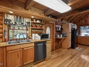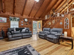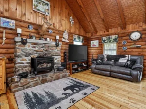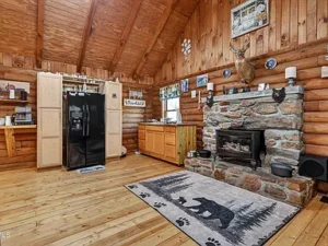 This 1.13-acre property in Mountain City, TN priced at $269,500 features a “true log home” design that’s becoming increasingly rare in today’s market. From the moment you step inside, you’ll notice the warmth and authenticity created by refinished wide-plank pine floors, exposed rough-sawn beams, and tongue-and-groove pine walls and ceilings. The main living area showcases a spacious great room with vaulted ceilings and a stunning stone fireplace, complete with a black cast-iron gas stove that provides both ambiance and a reliable heat source during colder months.