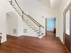 From the moment you enter, the home makes a statement with a two-story foyer highlighted by a grand staircase that sets an elegant tone. Flanking the entry are two expansive living room areas, each centered around its own fireplace, creating inviting spaces designed for comfort, conversation, and entertaining. These rooms offer flexibility for formal and casual use, while maintaining a cohesive sense of warmth and sophistication.