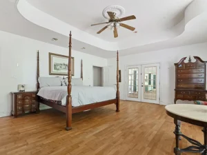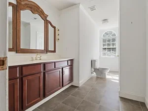 The primary bedroom is located on the main level, offering convenience and privacy. With direct access to the sunroom, the suite creates a peaceful retreat within the home. The primary bathroom is generously sized and designed for comfort, featuring his-and-her walk-in closets, double vanities, a large soaking tub, a separate shower, and a private toilet closet. With updates, this space has the potential to become a true spa-like sanctuary.
