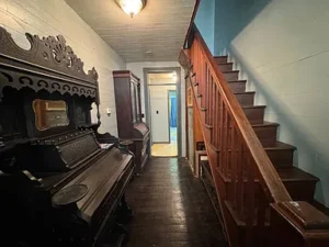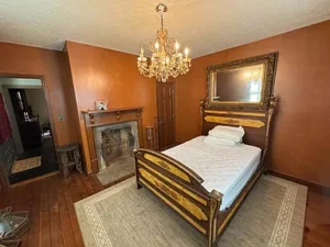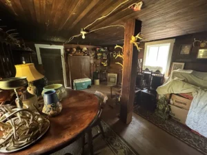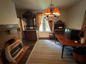 The farmhouse spans approximately 2,420 square feet and features four bedrooms and two full bathrooms, providing generous space for family and guests. Throughout the home, rustic hardwood floors, original horizontal wood-planked walls, tall ceilings, and antique woodwork highlight its authentic character. Two fireplaces add warmth and charm, while an array of antique furnishings enhances the historic atmosphere. The main level is thoughtfully arranged for convenient everyday living, offering a bedroom, full bathroom, laundry room, dining room, and kitchen, making first-floor living entirely possible. Upstairs, you’ll find two spacious bedrooms, a comfortable sitting room that could serve as an optional fourth bedroom, an additional full bathroom, and a utility room. Tall windows throughout the home bring in natural light and frame views of the surrounding landscape.