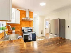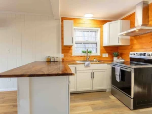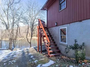 The main level welcomes you with an open-concept kitchen featuring warm butcher block countertops and stainless steel appliances, blending modern updates with chalet-style character. A bedroom and full bathroom are conveniently located on this level, along with a smaller side deck nestled against the hillside. The living and dining area is anchored by a large masonry fireplace and surrounded by expansive windows that frame sweeping views of the lake and surrounding mountains. A door leads directly to the main deck, creating a seamless indoor-outdoor connection.
