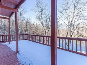 Upstairs, two additional bedrooms provide privacy and comfort, along with access to the upper-level deck. From here, the elevated perspective offers stunning panoramic mountain views and a clear overlook of the deep fishing lake below—an ideal setting for morning coffee or evening sunsets.