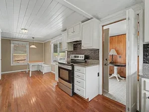Inside, this 0.78 acres property features easy main-level living designed for comfort and convenience. The spacious living room welcomes you with a cozy wood-burning stove, creating a warm and inviting atmosphere perfect for cooler mountain evenings. The layout flows naturally into the updated eat-in kitchen, where you’ll find custom cabinetry, durable quartz countertops, stainless steel appliances, and a charming corner dining nook that makes mealtime both functional and enjoyable.