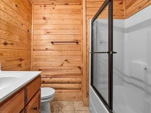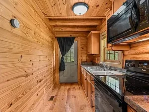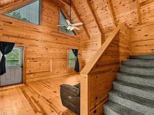 Inside, you’ll find warm wood finishes that create a cozy and welcoming atmosphere throughout. The living area invites you to relax and unwind, making it easy to picture quiet evenings or gatherings with friends and family. The layout is both practical and inviting, with the main level offering a versatile bedroom space that can also serve as a home office, hobby room, or guest area.