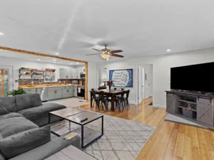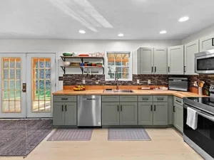 Inside, the home features a bright and inviting open-concept layout filled with natural light and stylish finishes throughout. The kitchen serves as the true centerpiece, showcasing high-end sage green cabinetry, rich butcher block countertops, a designer backsplash, and brand-new stainless steel appliances. A built-in wine and beverage refrigerator adds a touch of luxury, while thoughtful details like a garbage disposal and modern lighting elevate both form and function. Beautiful hardwood flooring flows seamlessly through the home, creating warmth and continuity in every room.