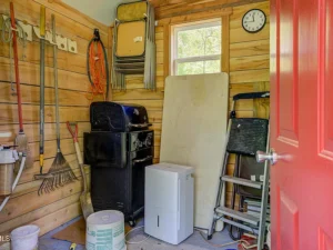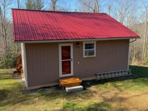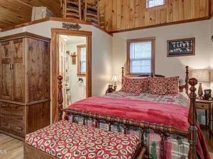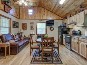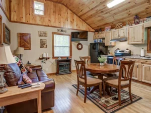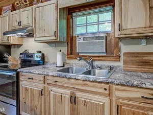 The kitchen is equipped with a full-size electric range, refrigerator, and generous hickory wood cabinetry for storage. A full bathroom with a tub and shower combination is also included, making the home practical for everyday living or weekend stays. Whether you’re using the property as a personal retreat or a rental, the cabin offers all the essentials.