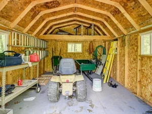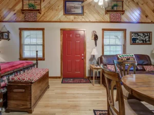 The cabin features a thoughtfully designed open-concept layout, making the most of its 384 square feet. Inside, you’ll find a combined living, sleeping, and dining space that feels both functional and comfortable. The interior showcases rustic finishes, including oak flooring and a warm pine ceiling, which together create a cozy, cabin-style atmosphere. High ceilings and natural light help the space feel more open and inviting.