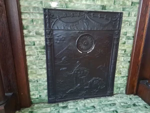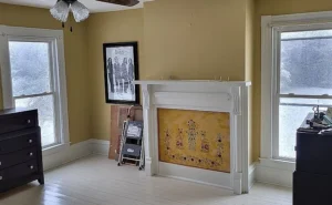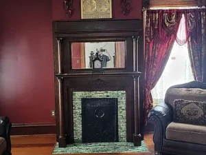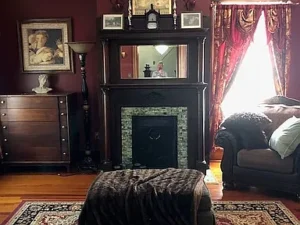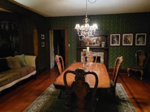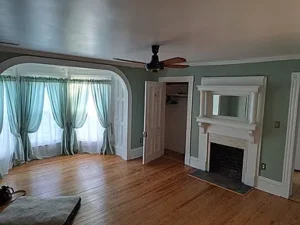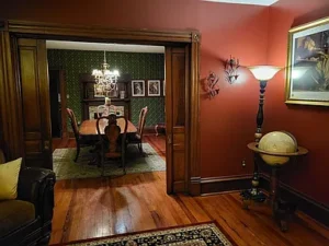 Inside, the 2,726-square-foot interior showcases craftsmanship that is difficult to replicate. Original wood floors run throughout much of the home, adding warmth and authenticity. The fireplace façade stands as a beautiful focal point, reflecting the home’s enduring style. Large, solid wood pocket doors separate the formal dining room and parlor, offering flexibility for entertaining or quiet evenings at home. These grand architectural details elevate the entire 5-acre South Hill property, reinforcing its manor-style appeal.