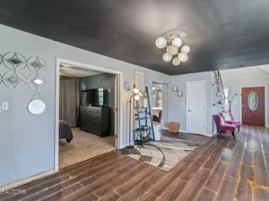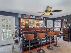 Inside, the home features four bedrooms and three full bathrooms, thoughtfully arranged with two bedrooms on the main level and two additional bedrooms upstairs. The welcoming foyer showcases vaulted ceilings, setting the tone for the generous scale found throughout the home. An oversized living room provides ample space for entertaining or relaxing, while a secondary sitting area includes a brick wood-burning fireplace and a built-in bar that will convey with the property. The open layout allows for flexible use of the living areas, making it well-suited for large households or those who enjoy hosting. The kitchen has been updated with stainless steel appliances, offering a modern touch while remaining functional and spacious.