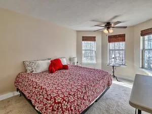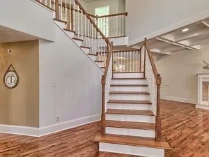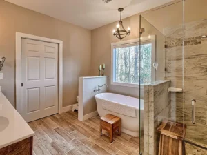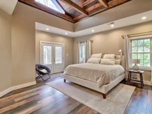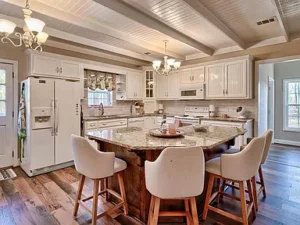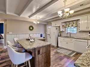 Inside the home, the inviting interior showcases thoughtful design and rustic charm. One of the highlights of this Johnston, SC property on 14 acres for $594,500 is the stunning main-level ensuite bedroom. This spacious suite features beautiful wood floors, exposed beams, and a warm rustic feel that perfectly complements the natural surroundings. The ensuite bedroom also offers private access to the deck and porch, allowing you to step outside and enjoy peaceful mornings surrounded by nature.