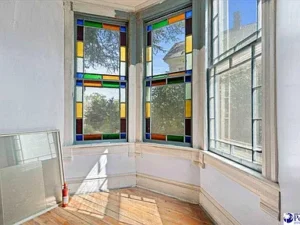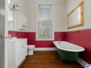Beautiful stained glass windows allow natural light to filter in with a colorful glow, enhancing the home’s historic ambiance. A classic butler’s pantry adds both charm and functionality, perfect for those who appreciate traditional layouts and entertaining spaces. The primary bedroom is conveniently located on the first floor and includes a private ensuite bathroom complete with a claw-foot tub, staying true to the home’s vintage style.